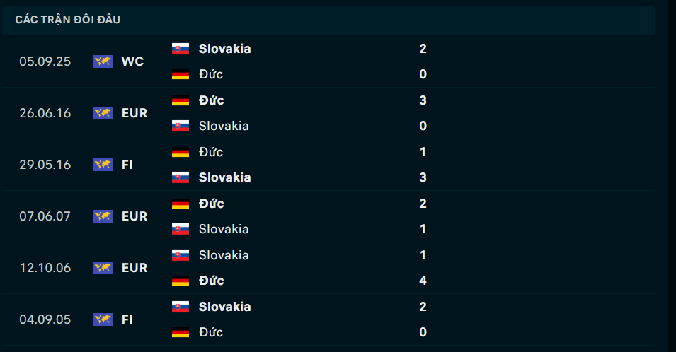 Lịch sử đối đầu Đức vs Slovakia
